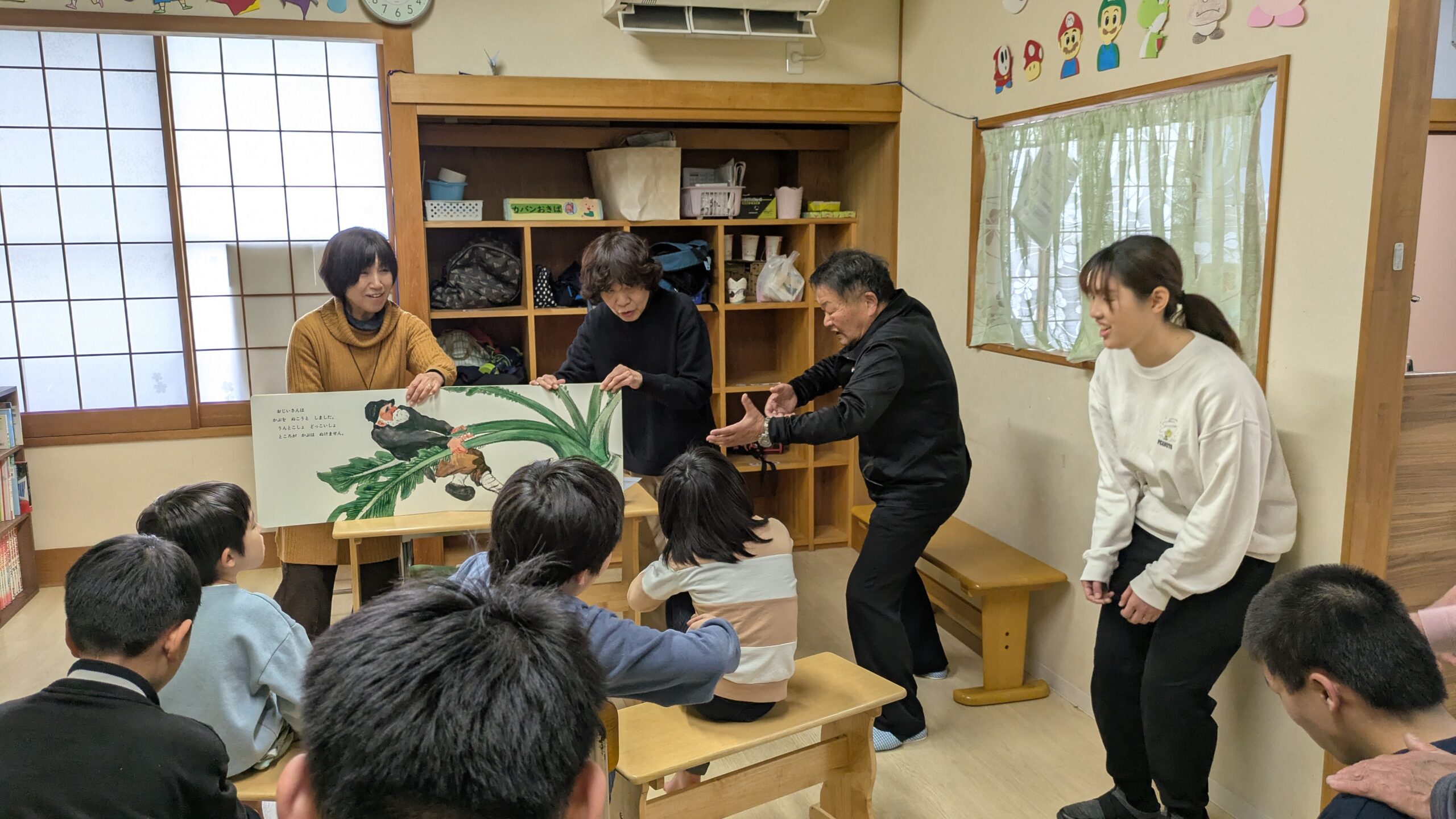 カブが抜けた瞬間、「やったー!」と万歳する子供たちの瞳は、キラキラとした達成感で溢れていました。放課後等デイサービスきっともっとみらいのみんなが、ひとつの大きな家族になった瞬間です。 『くいしんぼうのおしょうさん』では、おしょうさんのユーモラスな仕草に、お腹を抱えて大爆笑!「次はどうなるの?」と身を乗り出す子供たちの好奇心は、就労継続支援B型フロンティアで力強く働くお兄さんたちの背中に負けないくらい、輝いて見えました。