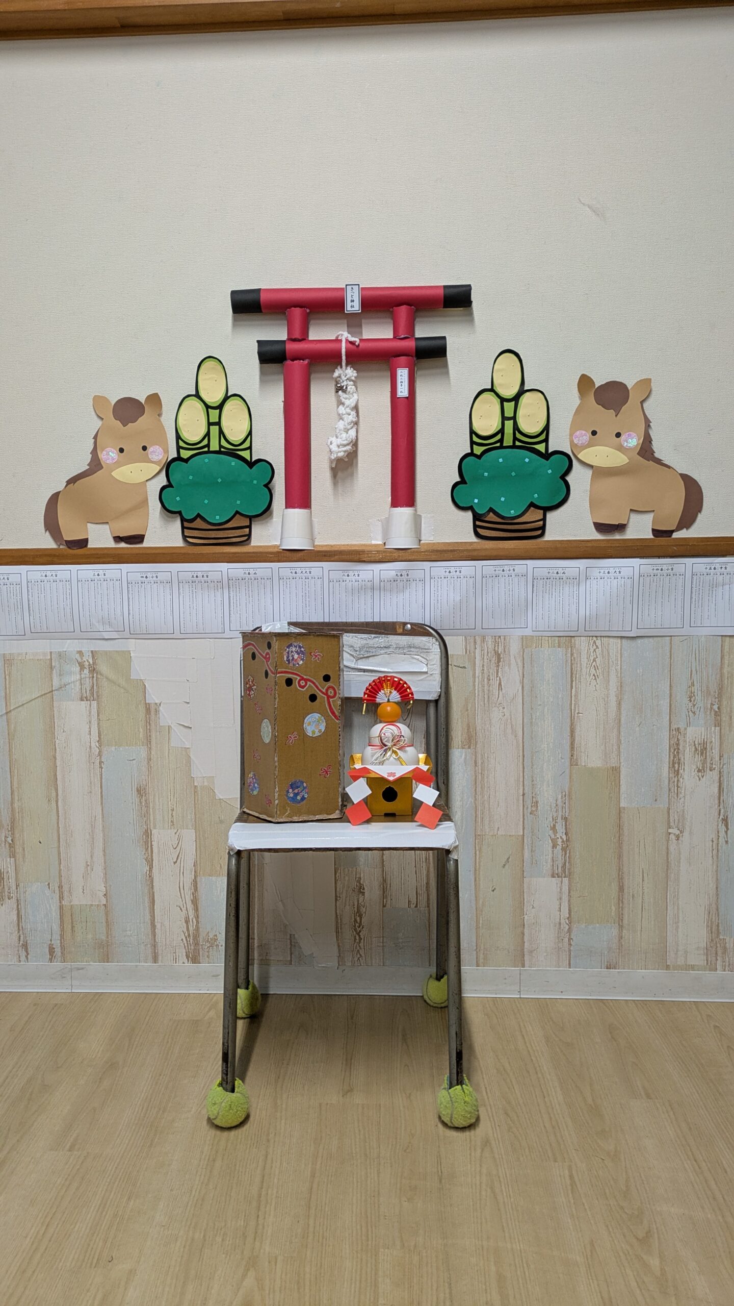 そんなみんなの想いを形にしようと、施設内には「きっともっとみらい神社」⛩が完成しました!👍 写真をご覧ください。手作りの赤い鳥居や、今にも駆け出しそうな可愛いお馬さんの切り絵。 お供え台に使っているイスの足に、床を傷つけないためのテニスボールがついているのも、 なんだかフロンティアらしい「優しさと工夫」が詰まっていて、見ているだけで心がホッと温まるのは私だけでしょうか?。(笑)